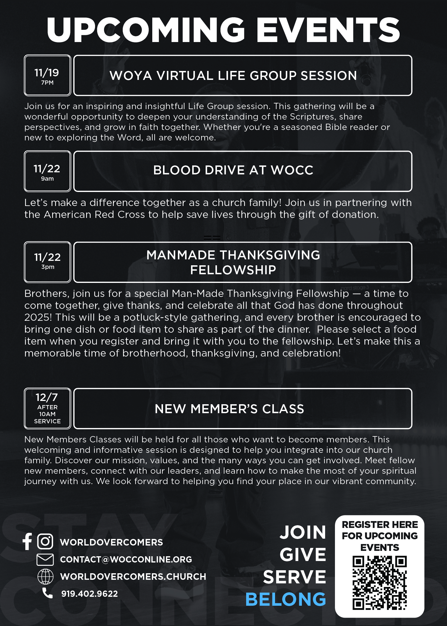 World Overcomers Christian Church is pleased to bless families in need this Thanksgiving season. Join us for our second Thanksgiving Basket Distribution, where we’ll provide meal baskets filled with everything…